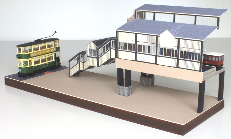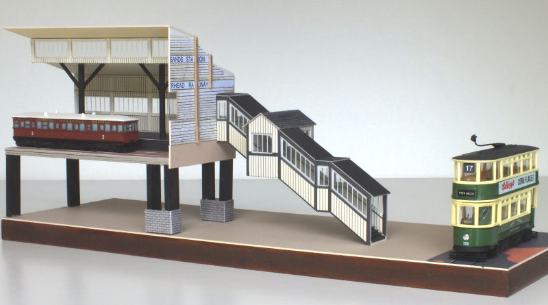 The Seaforth Sands model on this page represents just half of the old Overhead Railway station, allowing viewers to see the northern platform inside the building. To speed up the construction process, the structure was created using components from a 'Metcalfe' card model kit.